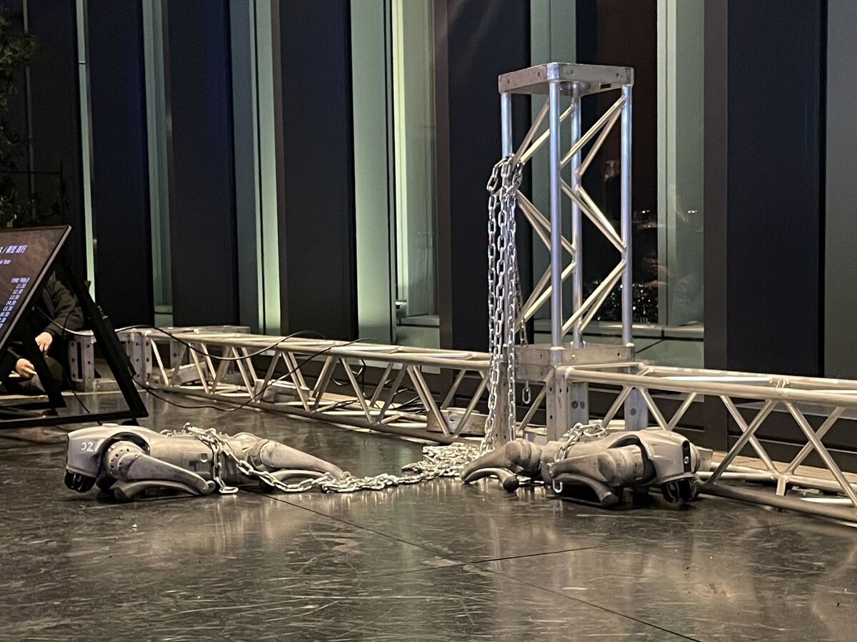 It’s a scene from a futuristic nightmare: A robot dog thrashes and lunges toward me, held back only by a metal chain that hits the floor with a heavy thud each time it pounces. The harder it fights, the more it snarls itself in the links, a machine trapped by its own struggle. Beside it, an identical quadruped from Hangzhou Unitree Technology Co. lies motionless, like a dead friend.