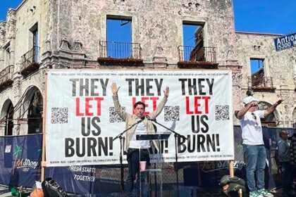 More than 1,000 fire victims gathered in front of ruins of the historic Pacific Palisades Business Block Building on Wednesday. More than 1,000 fire victims gathered in front of ruins of the historic ...